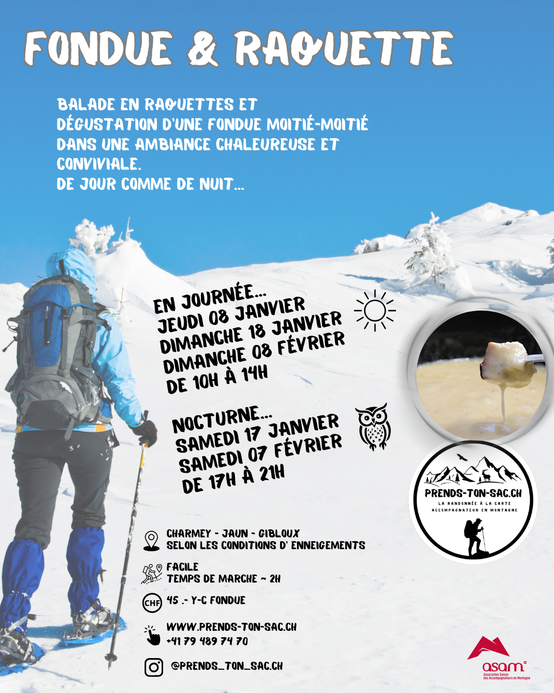 Balade en raquettes et dégustation d'une fondue moitié-moitié dans une ambiance chaleureuse et conviviale, de jour comme de nuit...